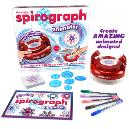 A new spin on the classic Spirograph design set! Create endless spiral art designs and then bring them all to life in amazing, mesmerizing motion with a spin of the animator and! Every design moves in a different way with each of the rotating light effects. The design and animation possibilities are endless! Also works with other Spirograph sets!