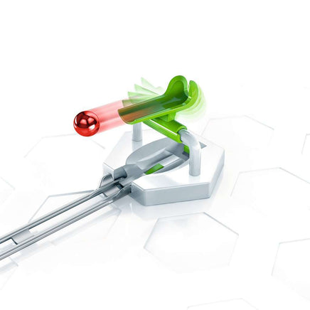 Send the marble in the reverse direction with the Flip! As the marble rolls into the Flip, it releases and transports up a level, slinging it in the opposite direction. This accessory also includes 6 additional tracks and must be combined with the GraviTrax Starter Set.